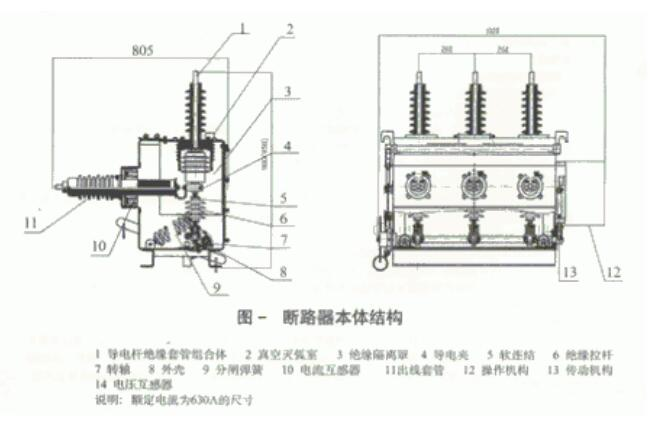 斷路器本體部分由導電回路,絕緣體系,密封件和殼體組成。全體結構為三相共箱式。其間導電回路由進出線導電桿,進出線絕緣支座,導電夾,軟銜接與真空滅弧室銜接而成。