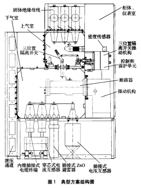 (1)高壓主電路的氣體絕緣技術和插接技術:對主電路電場進行了優化,以低壓力SF6氣體作絕緣介質;開發了內錐、外錐插接式電纜終端頭,插接式固體絕緣母線,采用硅橡膠絕緣的十字銜接套,端頭T形銜接套,插接式電壓互感器和避雷器。