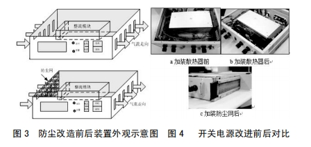 3.2在安裝本體進風(fēng)孔加防塵網(wǎng),避免灰塵進入安裝內(nèi)部,設(shè)備維護人員定期對濾網(wǎng)停止打掃,從而減輕元器件外表覆塵,利于安裝正常散熱,如圖3所示加裝防塵網(wǎng)后開關(guān)電源表示圖。對安裝施行上述改良后,其改良前后比照如圖4所示。