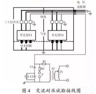 本次試驗(yàn)對(duì)母線進(jìn)行交流耐壓試驗(yàn),按圖4進(jìn)行試驗(yàn)接線,加壓端口在4×15避雷器電纜插口處。