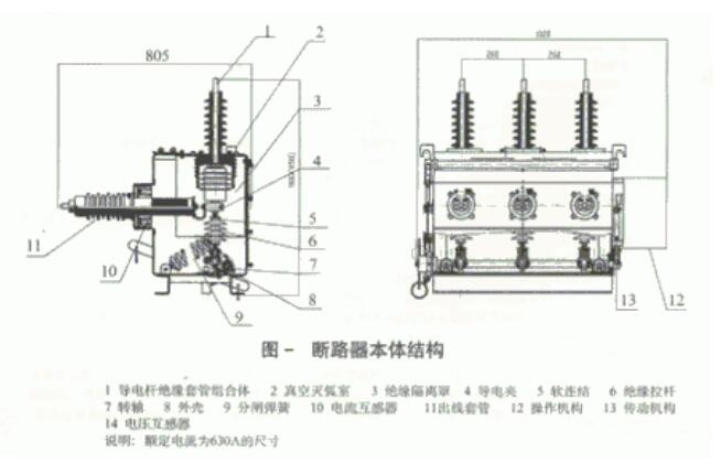 斷路器本體部分由導電回路,絕緣系統,密封件和殼體組成。整體結構為三相共箱式。其間導電回路由進出線導電桿,進出線絕緣支座,導電夾,軟聯接與真空滅弧室聯接而成。