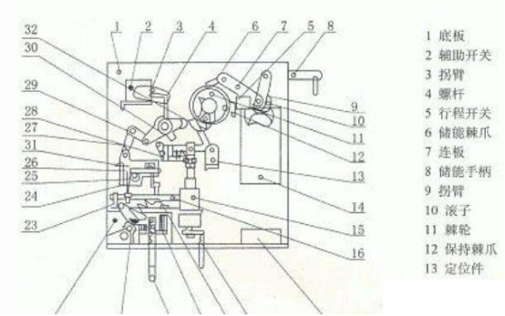 此安排為電動儲能,電動分合閘,一起具有手動功用。整個結構由合閘彈簧,儲能系統,過流脫扣器,分合閘線圈,手動分合閘系統,輔佐開關,儲能指示等部件組成。