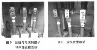 穿墻套管下部為出線,與電纜銅搭子導體部直接聯(lián)接,如圖5所示。吊銷聯(lián)接螺栓后產生聯(lián)接方位移動,如圖6所示。此現(xiàn)象闡明電纜銅搭子與穿墻套管存在很大的聯(lián)接變形,并產生應力,在電纜通電后產生的電動力和聯(lián)接應力進一步效果于穿墻套管,使得穿墻套管產生碎裂。